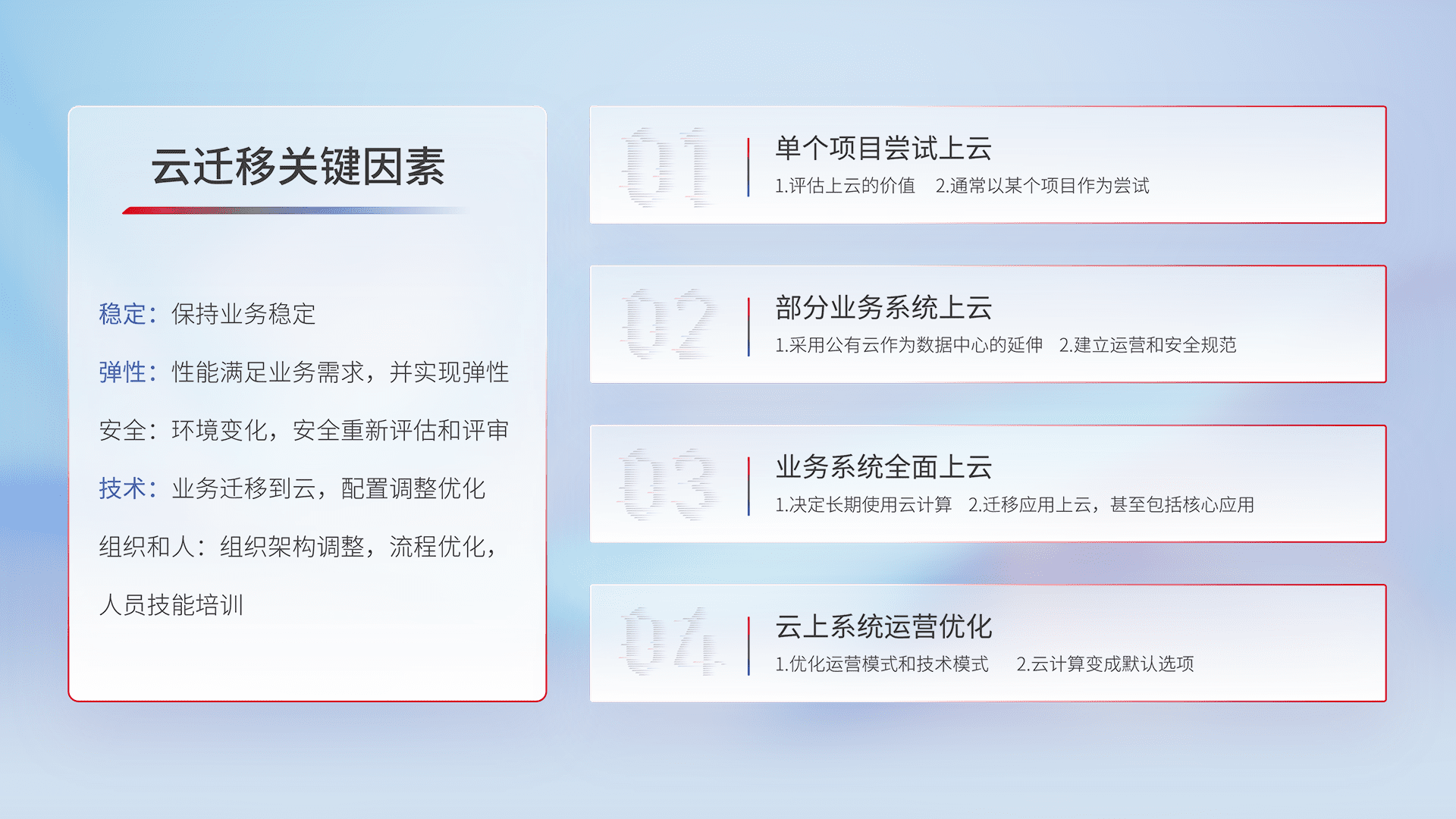 结合实际业务,,,,从规划设计、、云平台选型、、、云原生改造、、、数据迁移、、、集成交付,,,迁移全过程为客户识别最佳上云路径,,,做好风险识别管理,,,设计网络架构、、、、身份权限、、安全审计合规、、操作审计、、、、日志审计、、监控告警策略、、、多站点容灾设计等,,,,对云上基础设施进行整体规划,,提升IT治理水平,,以满足弹性、、、、高可用、、、高性能的需求。。