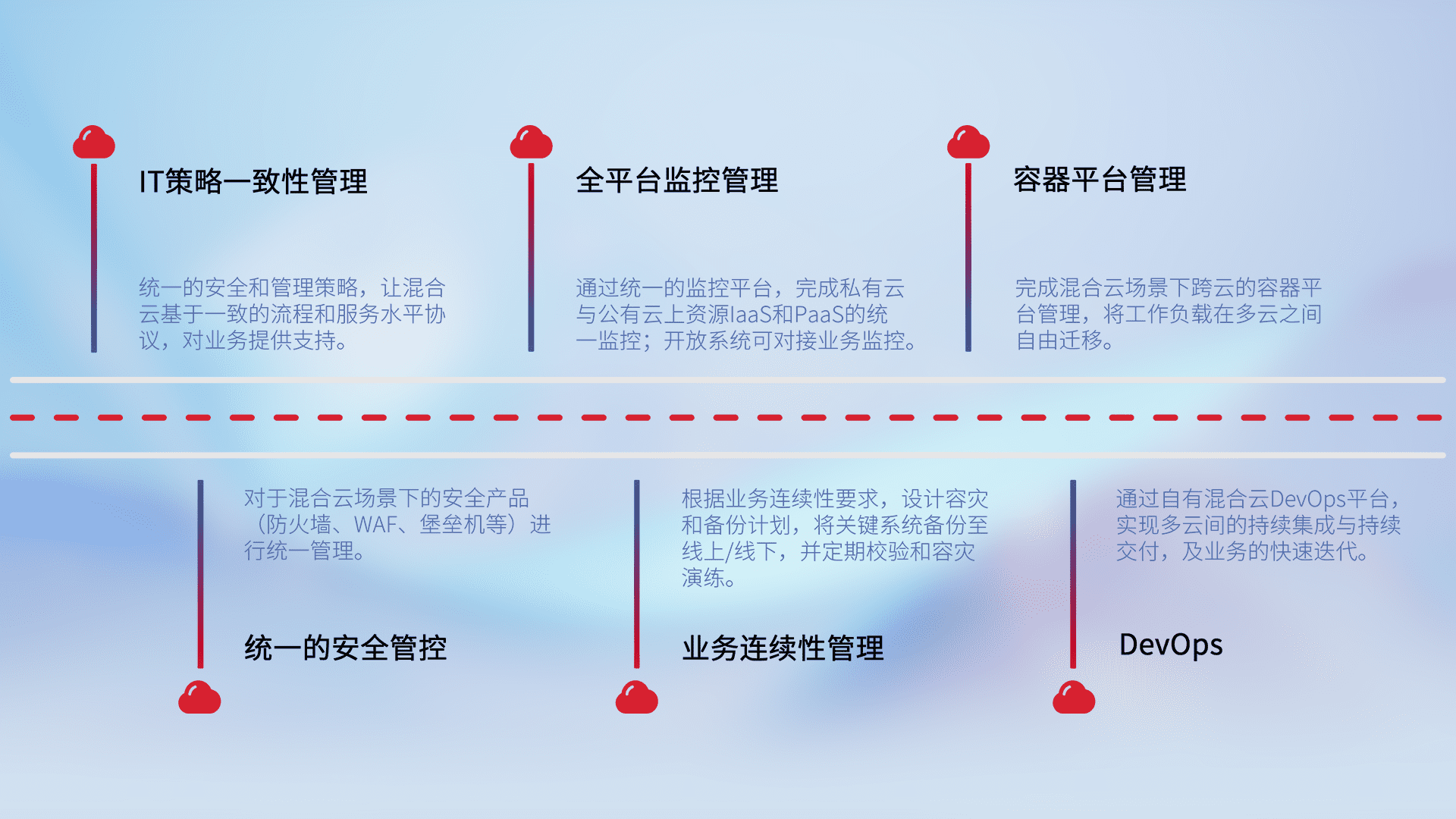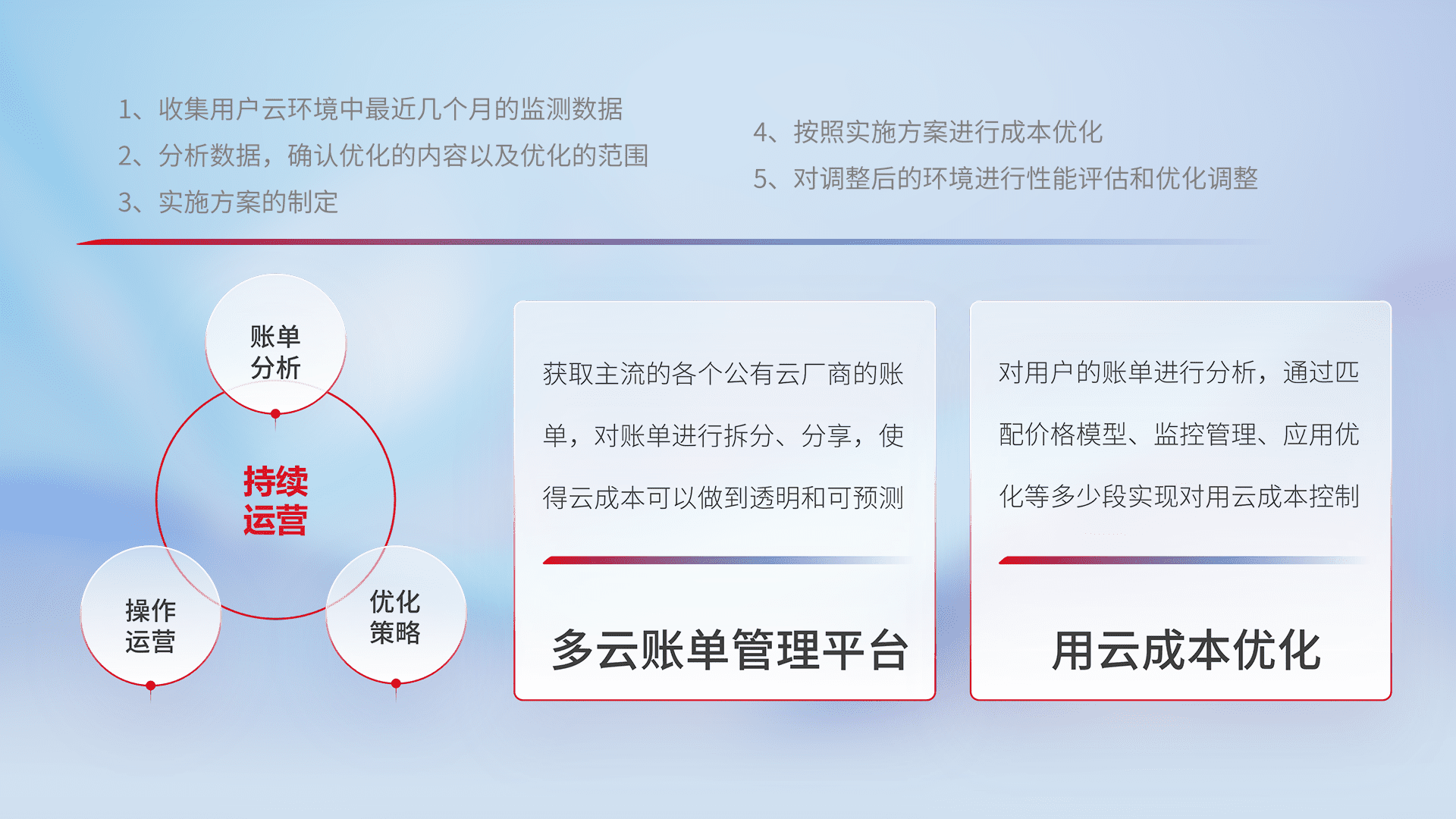 通过多云纳管,,,以统一的资源数据模型把客户的云资源进行抽象和封装,,进而实现对多云资源的统一操作,,,保障云资源管理的可靠性、、、稳定性与可用性。。量身定制化运维内容,,,配置、、开发运维、、补丁管理、、备份、、、监控、、认证和访问管理、、、审计和日常巡检等,,,,保障在用云过程中的可靠度,,稳定度以及高可用率。。