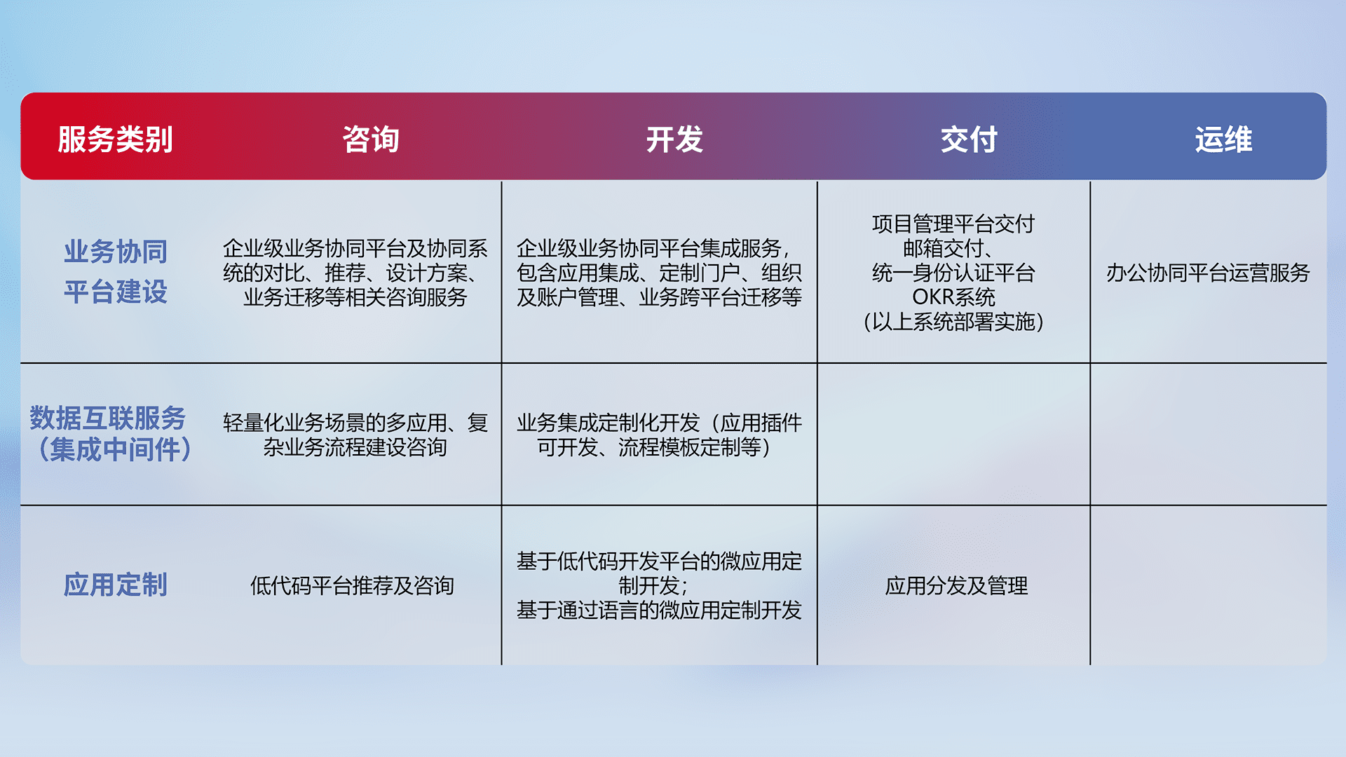 针对钉钉、、、、企微、、、、IDaas等平台级产品提供产品的规划、、、方案、、、交付、、、、定制化开发等服务,,,,实现如统一协同办公、、、、智能客户服务、、、、混合会议管理、、智能数据查询、、、、等业务场景,,实现数字化转型。。。
